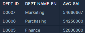 SELECT D.DEPT_ID, D.DEPT_NAME_EN, ROUND(AVG(E.SAL),0) AS AVG_SAL