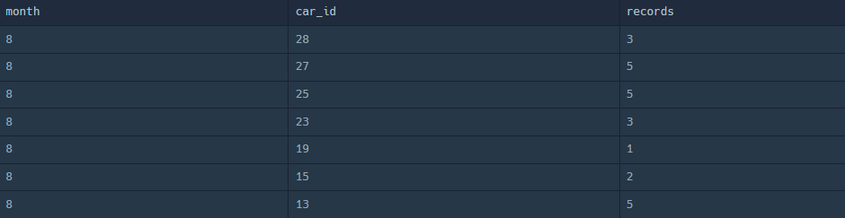 select to_number(to_char(a.start_date, 'MM')) as "month", a.car_id, count(*) as "records"